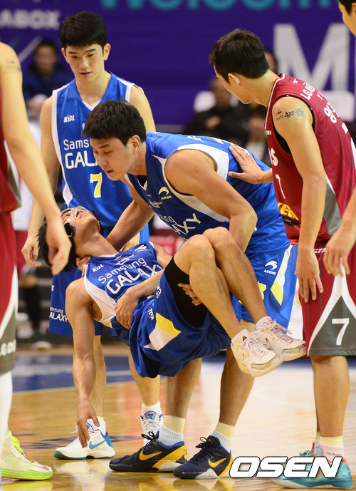 3쿼터, 부상을 당한 삼성 이시준이 코트에서 일어나지 못하자 삼성 유성호가 이시준을 안고 있다.