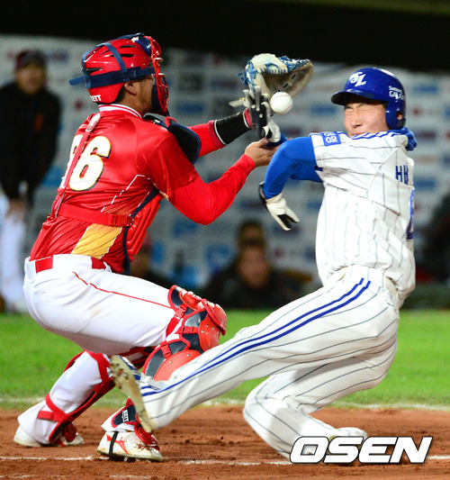 10일 오후 부산 사직구장에서 열린 '마구매니저 아시아시리즈 2012' 삼성 라이온즈와 차이나 스타즈의 경기, 1회말 무사 1루 삼성 정형식이 좌전 적시타때 1루주자 배영섭이 홈으로 쇄도해 세이프 되고 있다.