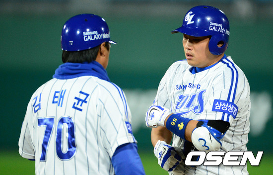 10일 오후 부산 사직구장에서 열린 '마구매니저 아시아시리즈 2012' 삼성 라이온즈와 차이나 스타즈의 경기, 1회말 1사 1,2루 삼성 이지영이 우전 적시타를 치고 김태균 코치와 이야기를 나누고 있다.