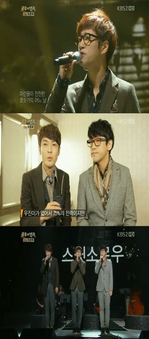 이날 스윗소로우는 멤버 송우진을 제외한 세 명만이 무대에 올랐다. 사전 녹화를 앞두고 멤버 송우진과 김영우가 함께 교통사고를 당했던 것. 심각한 상황은 아니지만 그날 사고로 인해 스윗소로우는 병상에서 '불후' 무대를 준비할 수 밖에 없었다고. 당초 송우진을 중심으로 무대를 짰지만 그는 부상 정도가 가장 심해 결국 이날 무대에는 오르지 못해 안타까움을 샀다.