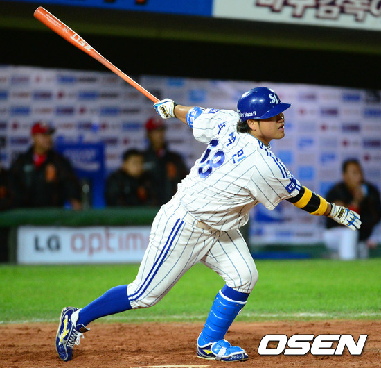 10일 오후 부산 사직구장에서 열린 '마구매니저 아시아시리즈 2012' 삼성 라이온즈와 차이나 스타즈의 경기, 4회말 1사 삼성 박석민이 중전 2루타를 치고 있다.