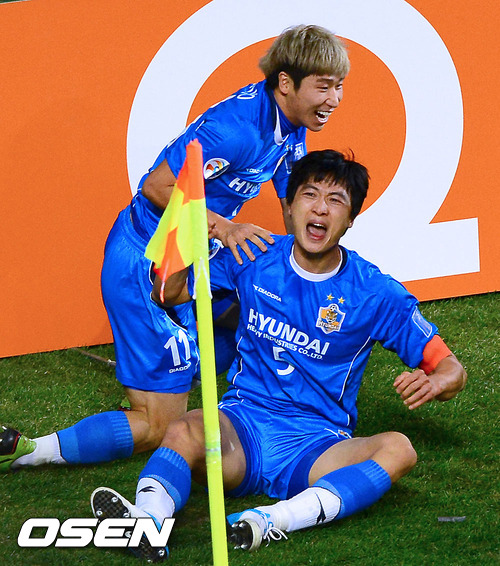 10일 오후 울산 문수축구경기장에서 열린 '2012 아시아축구연맹(AFC) 챔피언스리그' 결승전 울산 현대와 알 아흘리(사우디아라비아)와의 경기 전반 울산 곽태휘가 선취골을 넣고 환호하고 있다