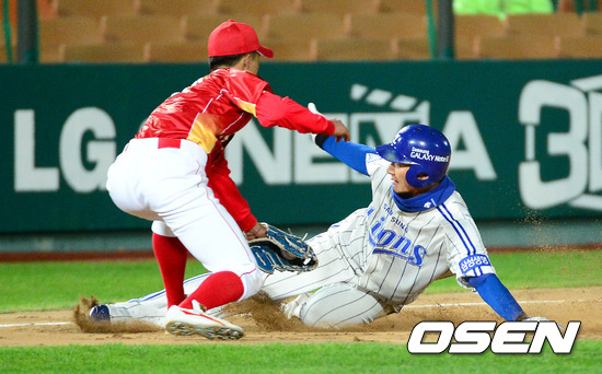 10일 오후 부산 사직구장에서 열린 '마구매니저 아시아시리즈 2012' 삼성 라이온즈와 차이나 스타즈의 경기, 5회말 1사 1루 삼성 최형우의 우전안타때 1루주자 손주인이 3루까지 쇄됴해 세이프되고 있다.