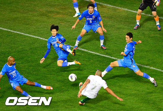 10일 오후 울산 문수축구경기장에서 열린 '2012 아시아축구연맹(AFC) 챔피언스리그' 결승전 울산 현대와 알 아흘리(사우디아라비아)와의 경기 전반 울산 수비수들이 알 아흘리 공격을 온몸으로 막아내고 있다