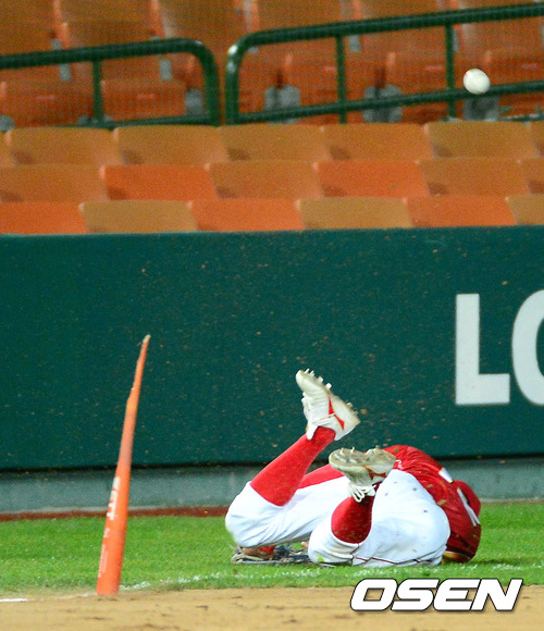 10일 오후 부산 사직구장에서 열린 '마구매니저 아시아시리즈 2012' 삼성 라이온즈와 차이나 스타즈의 경기, 8회말 2사 차이나 두시아오레이가 삼성 박석민의 파울타구를 잡으려다 넘어지고 있다.