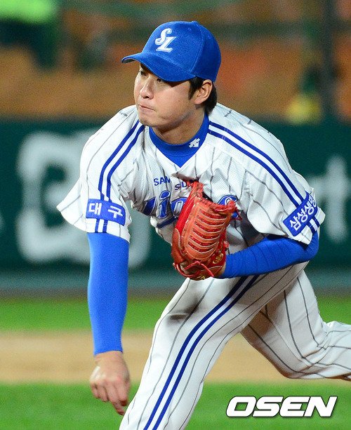 10일 오후 부산 사직구장에서 열린 '마구매니저 아시아시리즈 2012' 삼성 라이온즈와 차이나 스타즈의 경기, 9회초 삼성 김효남이 힘차게 공을 던지고 있다.