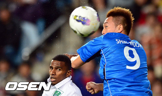 10일 오후 울산 문수축구경기장에서 열린 '2012 아시아축구연맹(AFC) 챔피언스리그' 결승전 울산 현대와 알 아흘리(사우디아라비아)와의 경기 후반 김신욱이 문전에서 헤딩으로 페스를 시도하고 있다.