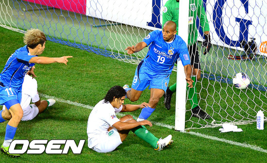 10일 오후 울산 문수축구경기장에서 열린 '2012 아시아축구연맹(AFC) 챔피언스리그' 결승전 울산 현대와 알 아흘리(사우디아라비아)와의 경기 후반 울산 하피냐가 추가골을 넣고 환호하고 있다