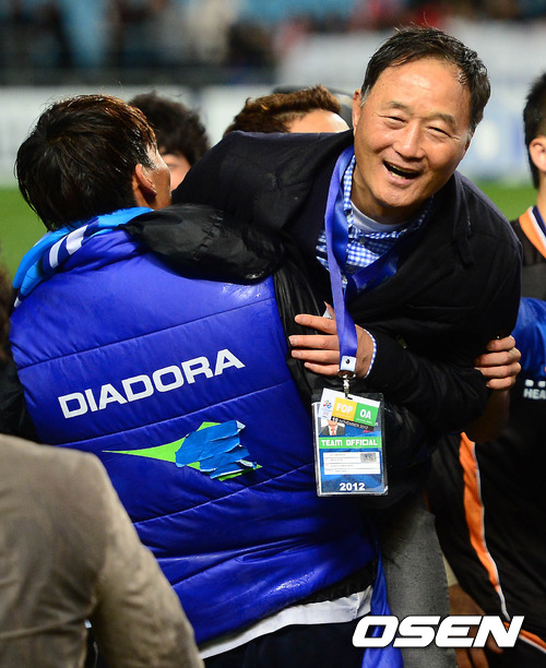 10일 오후 울산 문수축구경기장에서 열린 '2012 아시아축구연맹(AFC) 챔피언스리그' 결승전 울산 현대와 알 아흘리(사우디아라비아)와의 경기 종료 후 김승규가 김호근 감독을 번쩍 안고 있다.