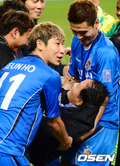 10일 오후 울산 문수축구경기장에서 열린 '2012 아시아축구연맹(AFC) 챔피언스리그' 결승전 울산 현대와 알 아흘리(사우디아라비아)와의 경기 종료 후 김호근 감독이 선수들에게 헹가래를 받고 있다.