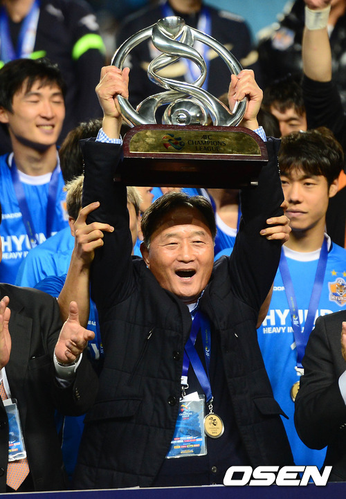 10일 오후 울산 문수축구경기장에서 열린 '2012 아시아축구연맹(AFC) 챔피언스리그' 결승전 울산 현대와 알 아흘리(사우디아라비아)와의 경기 종료 후 김호곤 감독이 우승 트로피를 들고 환호하고 있다.