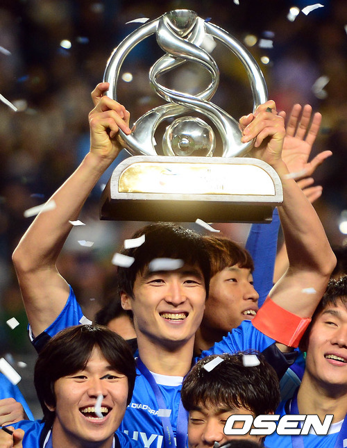 10일 오후 울산 문수축구경기장에서 열린 '2012 아시아축구연맹(AFC) 챔피언스리그' 결승전 울산 현대와 알 아흘리(사우디아라비아)와의 경기 종료 후 곽태휘가 우승 트로피를 들고 기념촬영을 하고 있다.