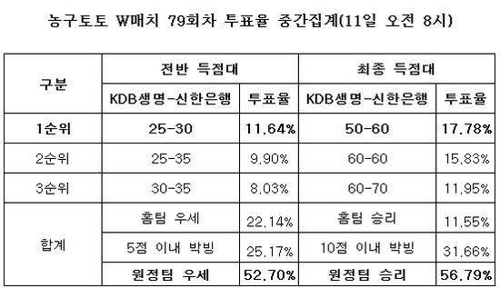 [농구토토] 국민체육진흥공단(www.kspo.or.kr)이 발행하는 체육진흥투표권 수탁사업자인 스포츠토토의 공식 온라인 발매 사이트 베트맨(www.betman.co.kr)이 12일 오후 7시 구리시체육관에서 벌어지는 2012-2013 여자프로농구(WKBL) KDB생명-신한은행전을 대상으로 한 농구토토 W매치 79회차 중간집계 결과 전체 참가자의 56.79%가 원정팀 신한은행의 완승을 전망했다고 밝혔다.