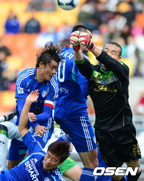 전반 전북 최은성이 수원 라돈치치 곽희주 김두현에 앞서 공중볼을 처리하고 있다.