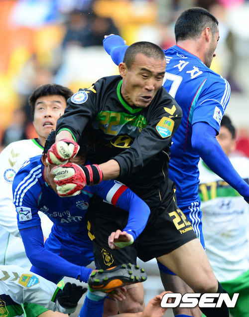 전반 전북 최은성이 수원 라돈치치 곽희주에 앞서 공중볼을 처리하고 있다.