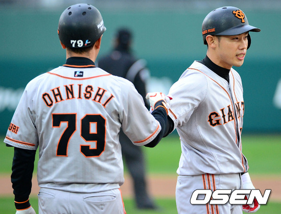 11일 오후 부산 사직구장에서 열린 '마구매니저 아시아시리즈 2012' 결승전 요미우리 자이언츠(일본)와 라미고 몽키즈(대만)의 경기, 6회초 1사 1,3루 요미우리 야노가 좌전 적시타를 치고 환호하고 있다.