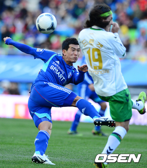 전반 삼성 오장은이 전북 드로겟을 앞에 두고 슈팅을 시도했지만 헛발질을 하고 있다.