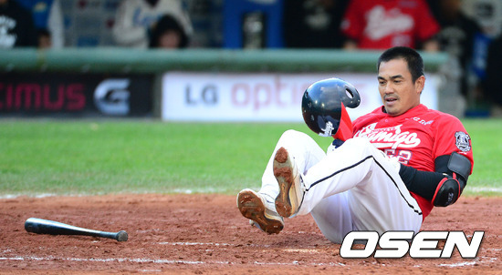 11일 오후 부산 사직구장에서 열린 '마구매니저 아시아시리즈 2012' 결승전 요미우리 자이언츠(일본)와 라미고 몽키즈(대만)의 경기, 7회말 라미고 천진펑이 타격 중 넘어지고 있다.