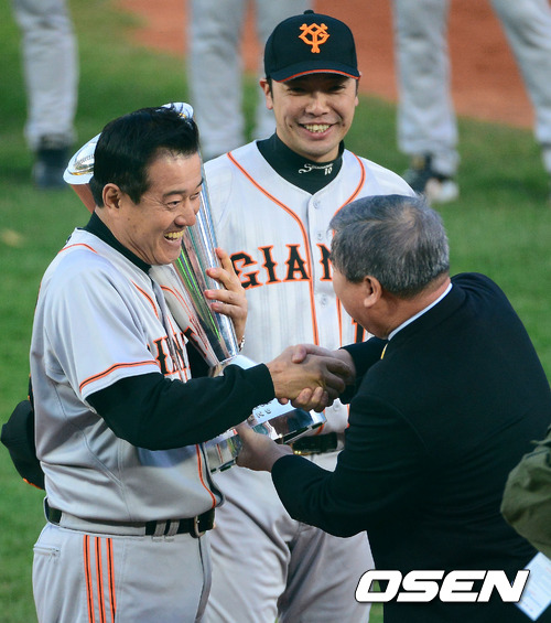 우승을 차지한 요미우리 하라 감독이 구본능 KBO 총재로부터 우승컵을 받고 있다. / sunday@osen.co.kr
