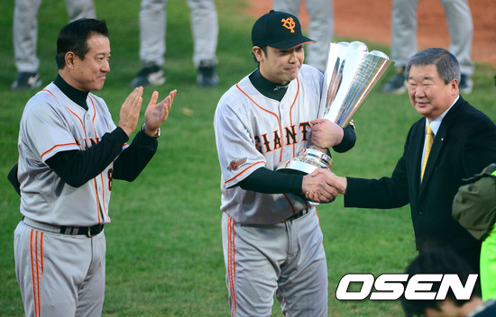 우승을 차지한 요미우리 아베가 구본능 KBO 총재로부터 우승컵을 받고 있다. / sunday@osen.co.kr