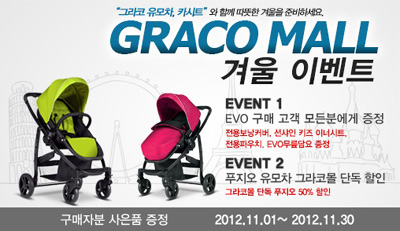 이벤트 기간 동안 그라코몰에서는(www.gracomall.co.kr) EVO유모차를 구매한 소비자에게 4가지 선물△EVO 전용보낭커버, △선샤인키즈이너시트(신생아 머리보호대), △전용파우치, △EVO무릎담요를 증정하고 푸지오 유모차를 50%할인 된 가격에 판매한다.