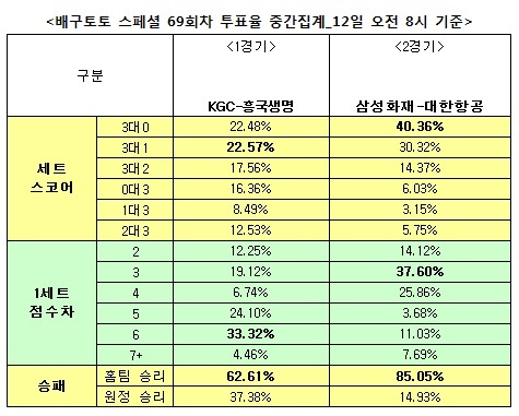 대한항공의 승리 예상은 14.93%로 나타났고, 최종 세트스코어에서는 3-0 삼성화재 승리(40.36%) 예상이 가장 높게 나타났다. 또 1세트 점수차 예상에서는 3점차(37.60%)가 1순위로 집계됐다.