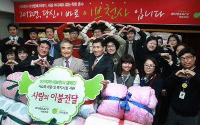 이브자리가 2012이브천사캠페인으로 마련된 2500여 겨울 이불을 불우이웃들에게 선물하는 전달식을 11월 12일 서울시 노원구 평화종합사회복지관에서 가졌다.