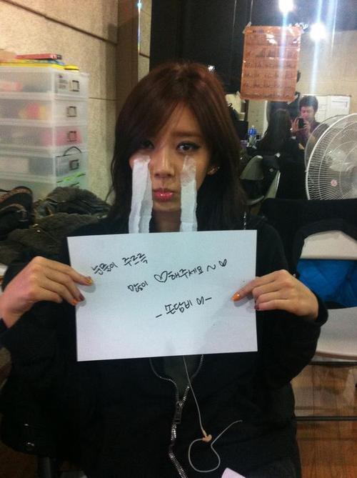 공개된 사진 속 손담비는 얼굴에 휴지를 붙인 채 눈물을 흘리는 듯한 장면을 연출했다. 손에 든 종이에는 "'눈물이 주르륵' 많이 사랑해주세요~"라는 문구가 적혀있다.