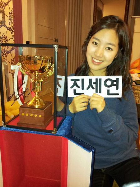 사진 속 진세연은 '런닝맨'에서 사용한 이름표를 들고 추신수 선수의 사인이 들어간 트로피 옆에 서있다. 해맑은 표정으로 트로피를 차지하게 된 기쁨을 나타내는 모습이다.