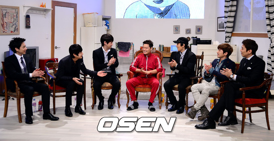 12일 오후 서울 중구 순화동 JTBC에서 진행된 '신화방송' 현장공개에서 신화멤버들이 자취의 달인과 이야기를 나누고 있다.