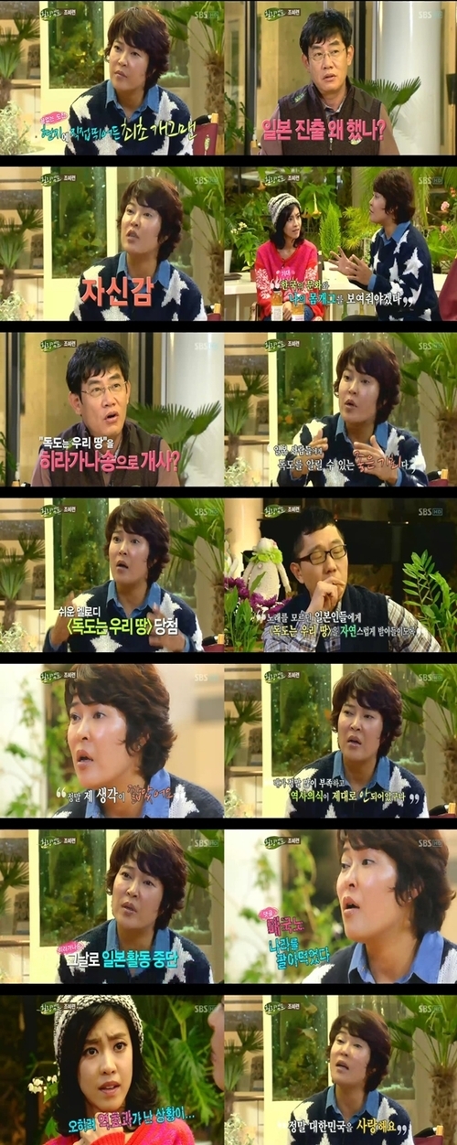 그는 “일본어 세 번째 책이었는데 출판사에서 아이디어를 줬다. 히라가나송으로 유명한 노래를 개사하자고 했고 ‘독도는 우리땅’이 당첨됐다”면서 “일본에게 강하게 어필하는 이 노래가 오히려 일본사람들에게 ‘독도는 우리땅’이라는 사실을 알려줄 수 있을 것 같았다”고 솔직하게 말했다.