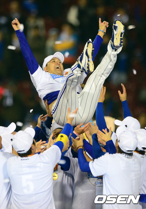 지난 1일 삼성의 한국시리즈 우승 후 오치아이 코치가 선수들에게 헹가래를 받고 있다.
