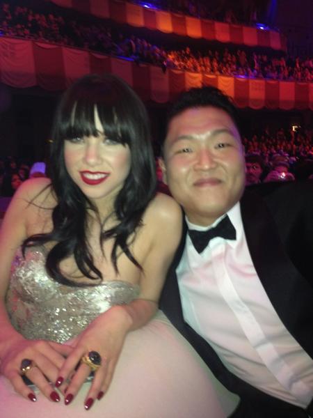 싸이는 13일 새벽 자신의 트위터를 통해 "칼리 레이 젭슨과 시상식 수상 기념 사진"이라는 글과 사진 한 장을 게재했다.