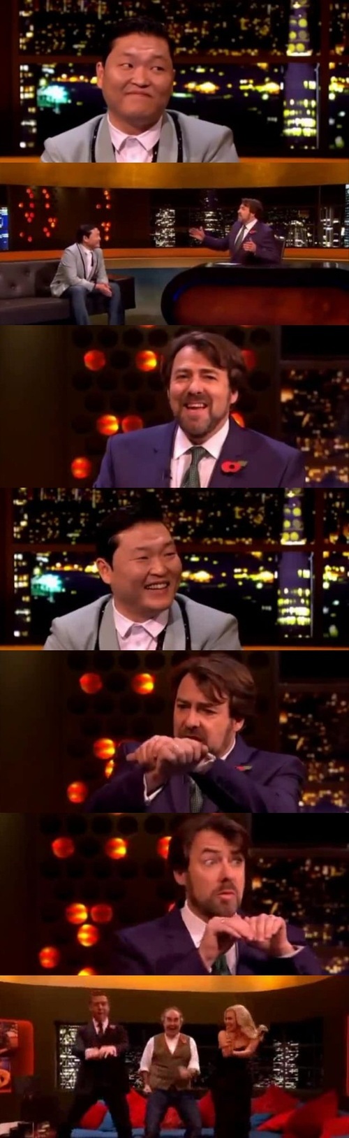 싸이는 지난 11일(한국 시간) 영국 ITV '조나단 로스 쇼(The Jonathan Ross Show)'에 출연해 현지 아나운서 겸 영화 평론가 조나단 로스와 유쾌한 대화를 나눴다.