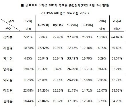 국내 골프팬들은 ‘KLPGA ADT캡스 챔피언십 2012” 1라운드에서 시즌 상금왕을 노리고 있는 김하늘의 언더파 가능성을 가장 높게 내다봤다.