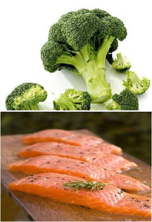 브로콜리에는 비타민 A, K가 함유 되어있어 눈가에 악영향을 끼치는 활성 산소를 제거해 주며 몸속의 혈액을 맑게 한다. 연어는 오메가3 지방산과 비타민E가 풍부해서 염증을 가라 앉혀주며 혈관 질환 개선에도 좋다.