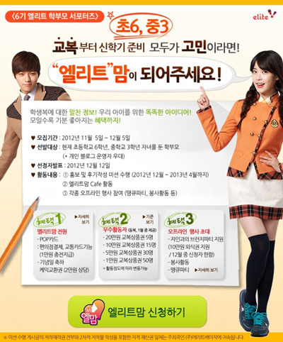 오는 12월 5일까지 모집하는 학부모 서포터스 ‘엘리트맘’은 엘리트맘 카페 회원 중 초6, 중3 자녀를 둔 학부모 누구나 신청할 수 있다. 선정자는 2013년 4월까지 엘리트 관련 홍보 미션 진행, 문화체험, 자녀와 함께하는 자원봉사 활동, 엘리트맘 활동을 마무리하는 땡큐파티 등 다양한 온·오프라인 활동에 참여한다.