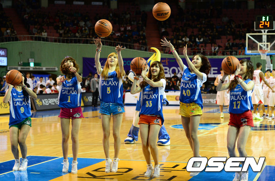 경기에 앞서 걸그룹 비비드걸이 시투를 하고 있다.
