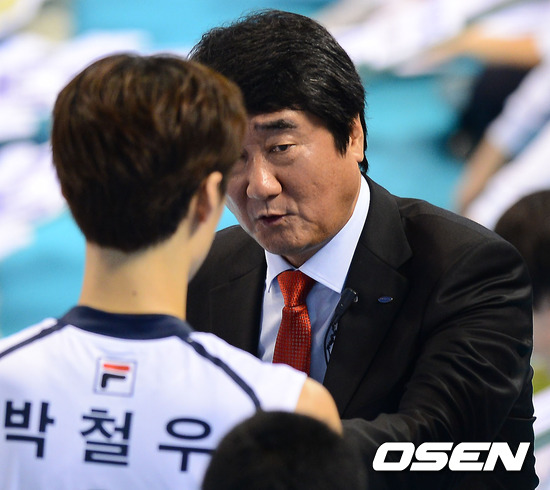 삼성화재 신치용 감독이 박철우에게 강한 어투로 말을 하고 있다.