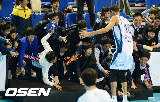 경기를 마치고 삼성화재 레오에게 팬들이 몰려 광고판이 넘어지고 있다. / rumi@osen.co.kr