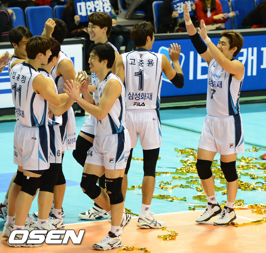 경기를 마치고 삼성화재 선수들이 코트 위에서 기쁨을 나누고 있다. / rumi@osen.co.kr