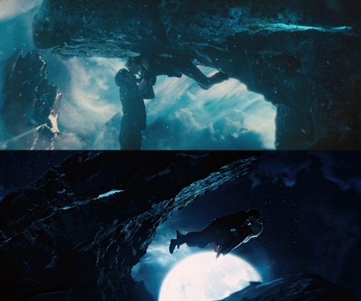 그 중 최고의 명장면은 바로 아담과 에덴의 로맨틱한 키스신. 구름이 엉켜있는 몽환적인 분위기 속의 ‘거꾸로 반전 키스’와 달빛을 무드 삼아 공중에 부유한 채 펼쳐지는 ‘무중력 키스’가 바로 그것이다. 특히 코발트 빛의 아름다운 색채감을 자랑하는 이 장면들은 커플들의 마음을 사로잡기에 충분하다. ‘거꾸로 반전 키스’는 중력이 가장 약하게 작용하는 지혜의 숲의 기암 절벽에서 ‘에덴’이 절벽에 거꾸로 매달린 채 ‘아담’과 눈 높이를 맞추고 나눴던 키스로 커스틴 던스트를 다시 한번 할리우드 대표 키스 메이커로 등극 시켰다. ‘무중력 키스’는 국경수비대에 의해 어쩔 수 없이 헤어졌다가 우여곡절 끝에 다시 만나게 된 ‘아담’과 ‘에덴’이 감동의 재회를 하고 나누는 키스로 보는 이들을 더욱 애틋하게 만들며 커플들이 뽑은 최고의 명장면으로 선정되었다.