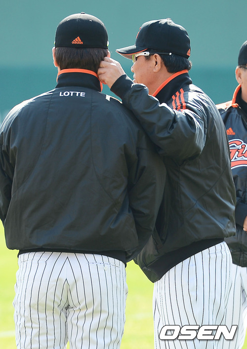 롯데 김시진 감독이 강민호의 귀를 잡아당기고 있다.