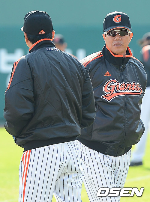 롯데 김시진 감독과 정민태 코치가 얘기를 나누고 있다.