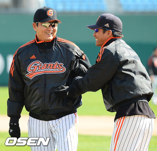 롯데 정민태 투수 코치에게 롯데 공필성 수비 코치가 환하게 웃고 있다.