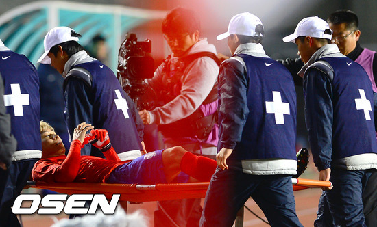 14일 오후 경기 화성시 화성종합경기타운에서 열린 하나은행 초청 축구대표팀 친선경기 한국과 호주의 평가전 전반 이근호가 부상으로 들것에 실려나가고 있다.