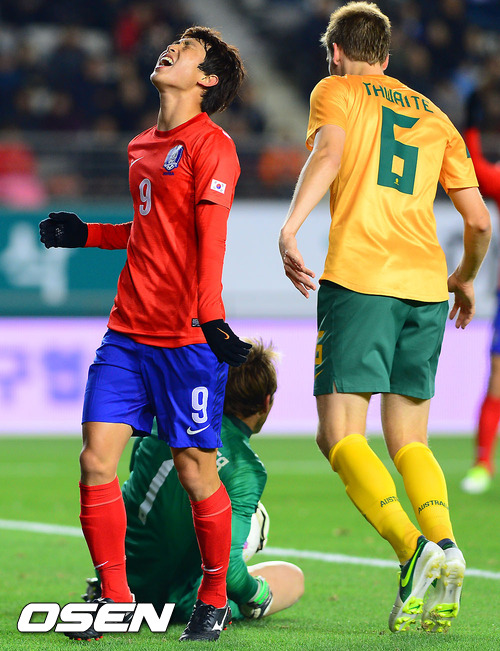 14일 오후 경기 화성시 화성종합경기타운에서 열린 하나은행 초청 축구대표팀 친선경기 한국과 호주의 평가전 후반 이승기가 골찬스를 놓친후 아쉬워하고 있다