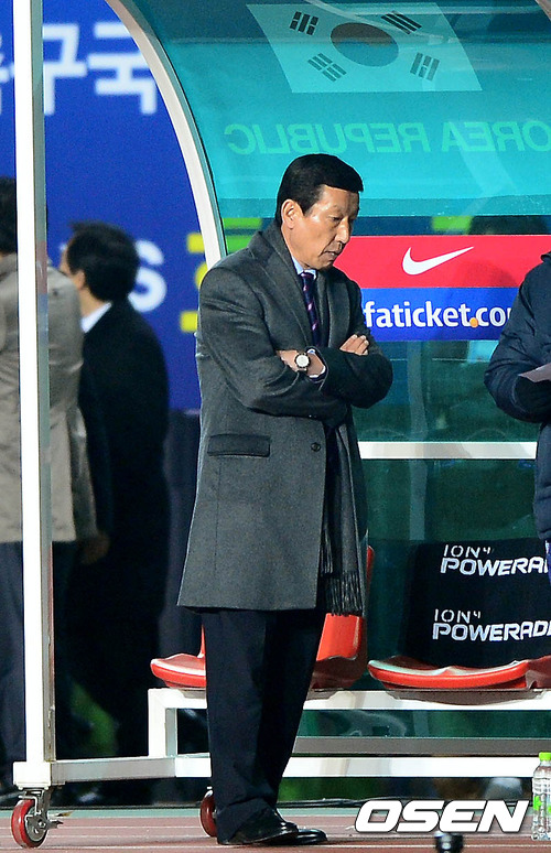 14일 오후 경기 화성시 화성종합경기타운에서 열린 하나은행 초청 축구대표팀 친선경기 한국과 호주의 평가전 경기 종료 직 후 최강희 감독이 고개를 떨구고 있다.