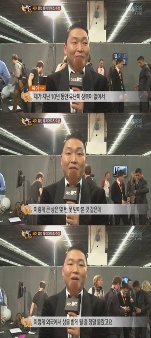싸이는 14일 오후 방송된 SBS '한밤의 TV연예'에서 "그동안 큰 상을 몇 번 못 받았는데 외국에서 받을 줄 몰랐다. 기쁜 날이다"고 소감을 전했다.