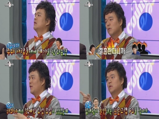 최승경은 14일 오후 방송된 MBC '황금어장-라디오스타'에 출연해 "아내가 방송에 출연한 모습을 처음 보고 주변 사람들에게 저 사람과 결혼하겠다는 말을 했다"며 "그 때는 사람들이 비웃었었다"고 전했다.